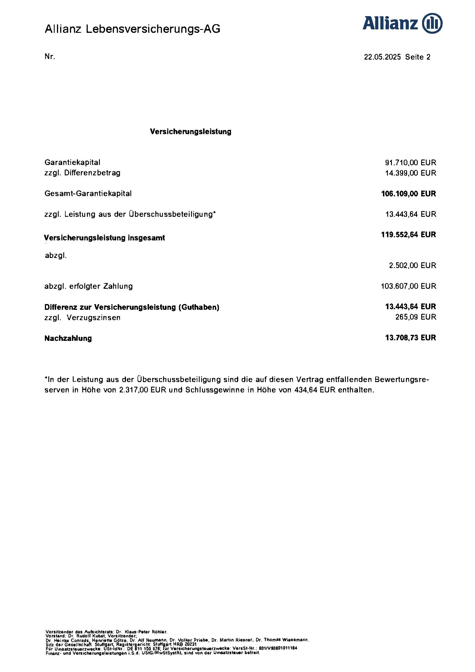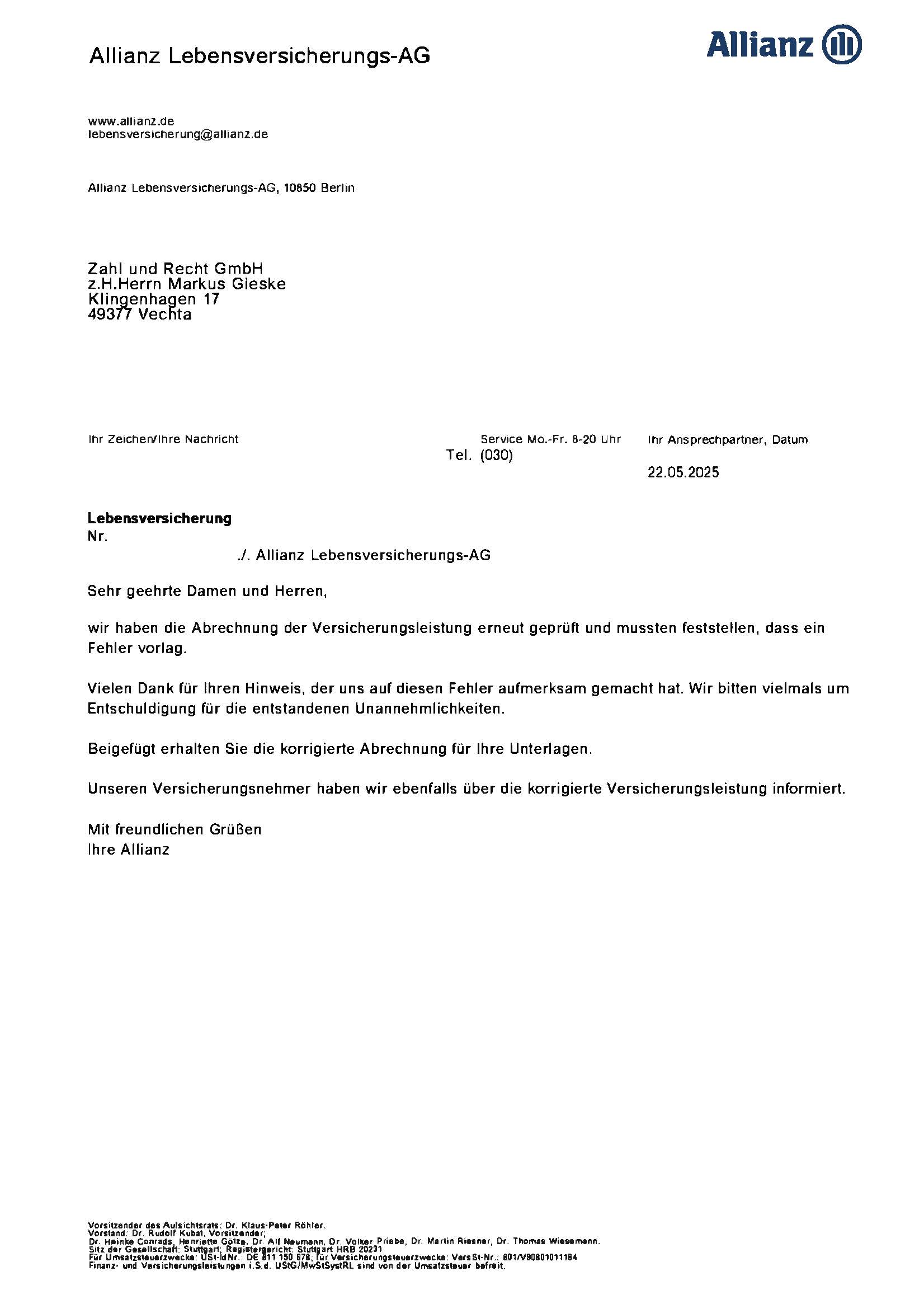 Praxisbeispiel der Zahl&Recht GmbH: Allianz Lebensversicherungs-AG rechnet nach Beitragsbefreiung wegen Berufsunfähigkeit 13.708,73 € zu wenig ab; Fall durch außergerichtliches Anerkenntnis der Allianz im Jahr 2025 erfolgreich beendet (Vertrag aus 1995)